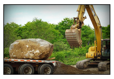 Two weeks later two large excavators , an eighteen wheeler ride from a blueberry field in Palermo Maine and one 40,000 lb. weathered rock later, we started the wall . On time ahead of schedule and exactly what the customer wanted.